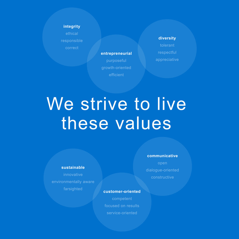 Our values: Number 6 plus 3 sub-values each. Each value is important to us and includes different perspectives. What unites them is a holistic attitude and responsibility. They provide orientation and are a promise against which we measure ourselves.