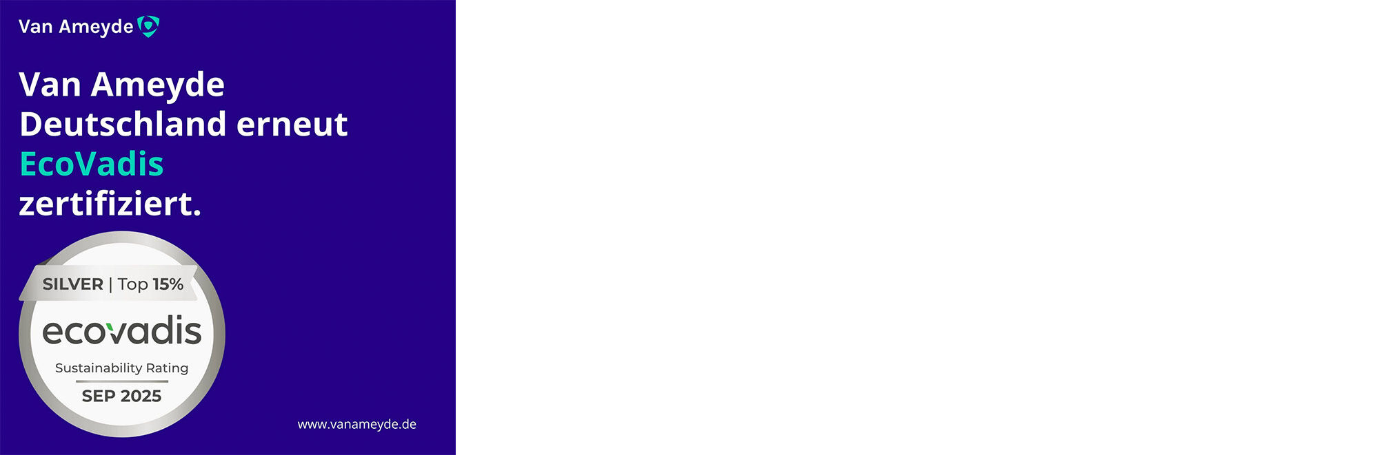 Zum wiederholten Male erhält die Van Ameyde Gruppe in Deutschland den Silber-Status im EcoVadis-Rating. Das Nachhaltigkeitsrating manifestiert eine Position unter den Top-15 % der nachhaltigsten Unternehmen, die sich dieser Bewertung unterzogen haben.